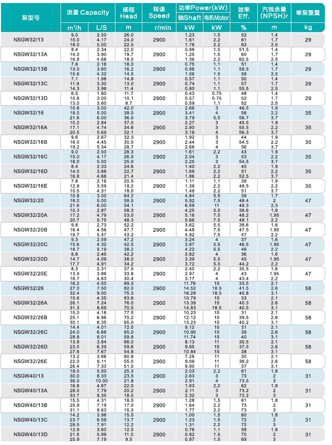 NSGW型泵供吸送清水及物理化學(xué)性質(zhì)類似于水的液體,適用于工廠、礦山、城市給水排水、空調(diào)、消防和農(nóng)囚排灌之用。規(guī)格相同的泵因改變?nèi)~輪外徑而有不同的性能(在泵型號后而加上A,B,C等字母表示)。本泵結(jié)構(gòu)簡單,性能可靠,體積小,重量輕,抗汽蝕性能好電耗低,使用維修方便。