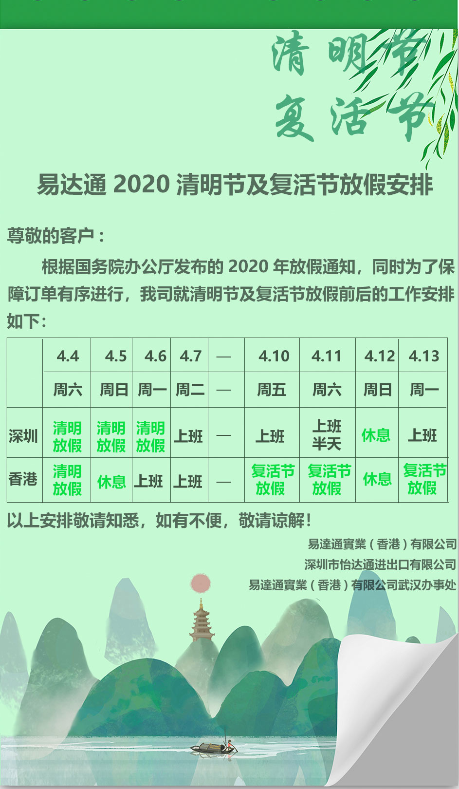 易達(dá)通2020清明節(jié)及復(fù)活節(jié)放假通知
