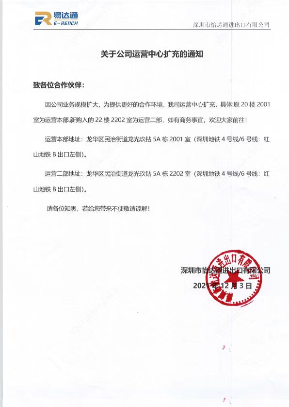 關(guān)于怡達(dá)通公司運營中心擴(kuò)充的通知