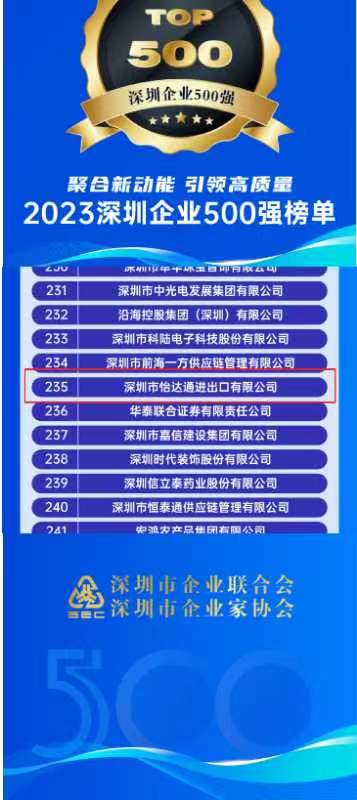 9月25日,深圳市企業(yè)聯(lián)合會(huì)、深圳市企業(yè)家協(xié)會(huì)正式發(fā)布“2023深圳企業(yè)500強(qiáng)榜單”,怡達(dá)通排名235位,這是對(duì)我們多年來(lái)不懈努力的最高肯定。