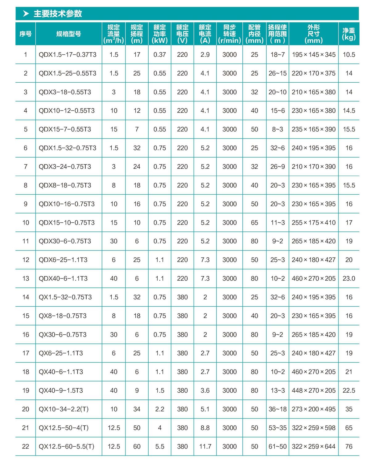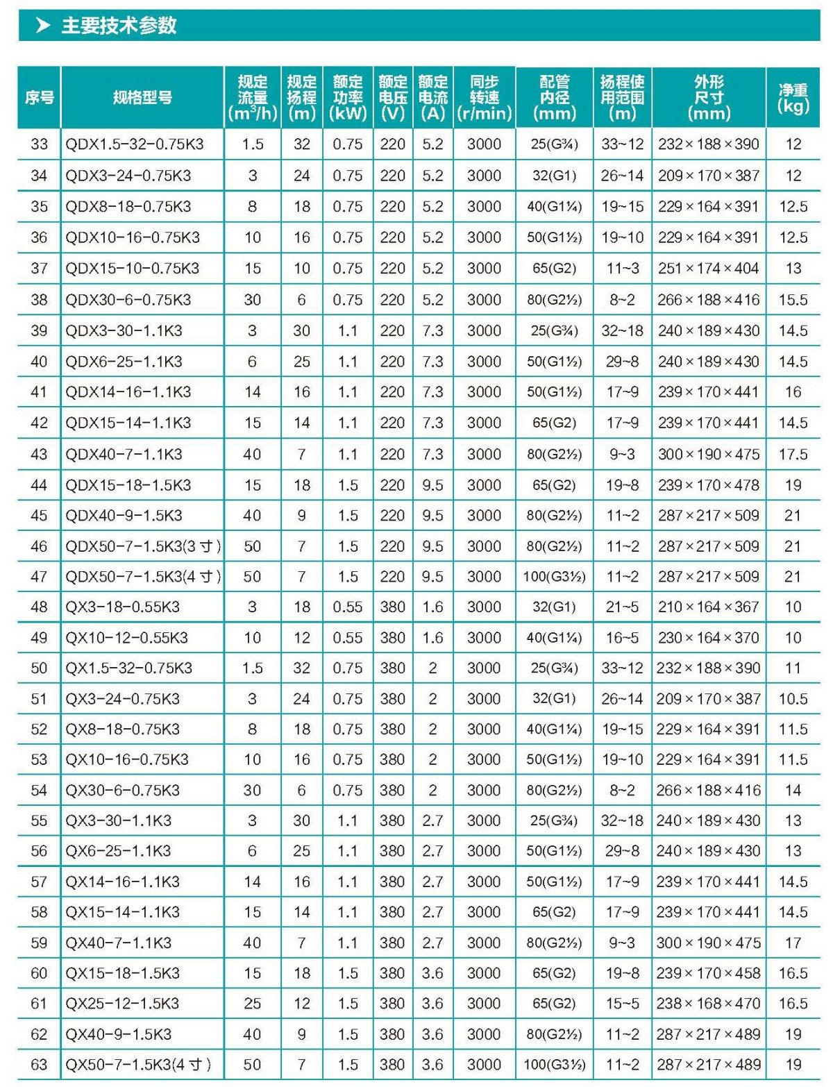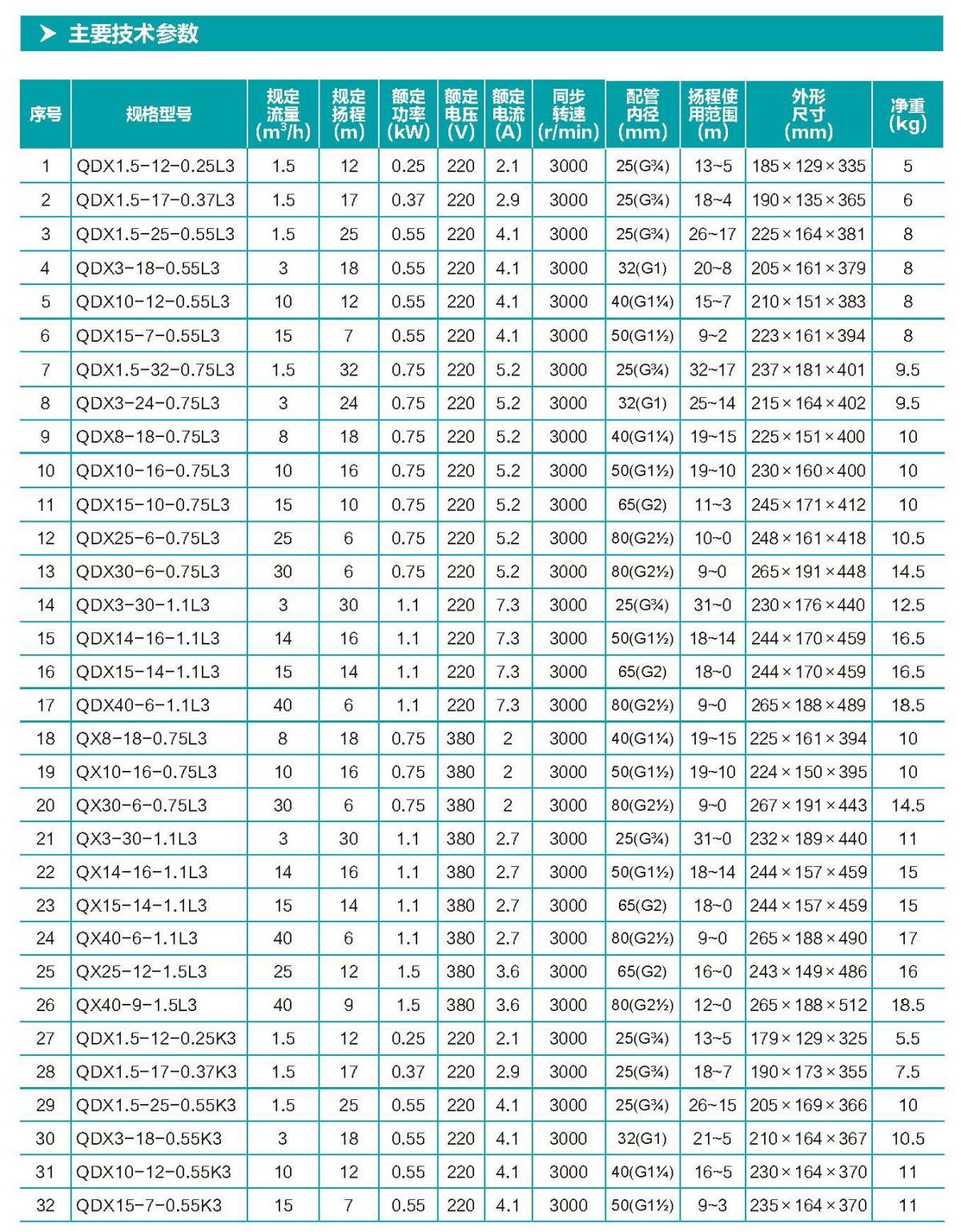 Q(D)X 型潛水電泵 ( 以下簡稱電泵),由水泵、密封、電動機三部分 組成。電泵內(nèi)配保護裝置,電動機位于電泵上部,為單相或三相異步 電動機;水泵位于電動機下部,為離心式葉輪,蝸殼結(jié)構(gòu);水泵與電 動機之間采用雙端面機械密封,各固定止口密封處采用“O”形耐油 橡膠密封圈作靜密封。
