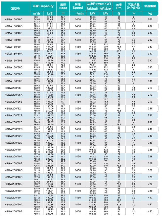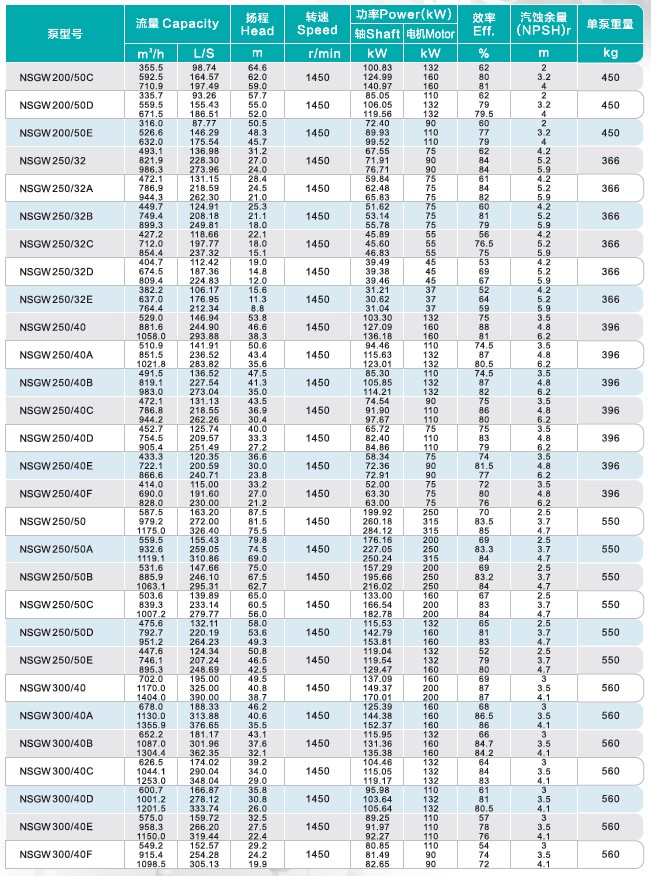 NSGW型泵通用性廣,全系列共60種規(guī)格,但只用四種軸,同-規(guī)格的軸、軸承、軸套、軸封、葉輪緊固件等均能互換,全系列泵的懸架也只有五種。