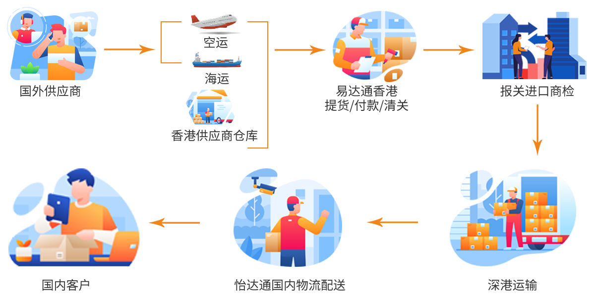 客戶和怡達通簽訂委托進口協(xié)議,我司在香港代付供應商貨款,收貨,海關申報,商檢,國內(nèi)配送,開增值稅發(fā)票,等配套服務,解決您海外采購難題。 客戶如在海關已注冊登記,我司可以代理報關,客戶直接使用海關發(fā)票抵扣,同時也可以享有,代付匯 香港收貨,港車服務,國內(nèi)配送等,讓自主報關成本更低,更便捷!