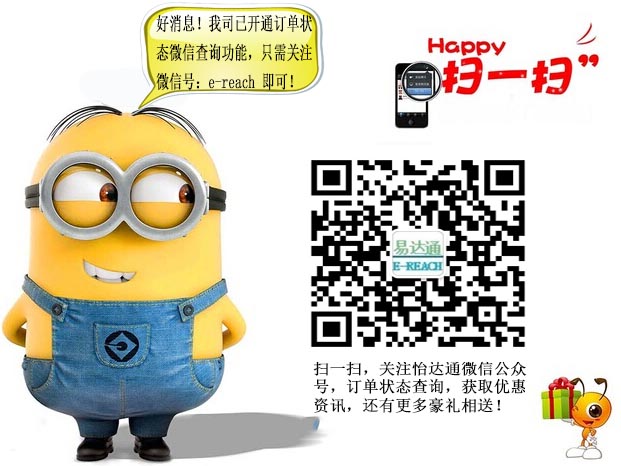 我司怡達(dá)通微信公眾號(hào)已開通訂單查詢功能,用戶只需關(guān)注微信號(hào):e-reach 即可使用!也可掃一掃下方的二維碼,快快關(guān)注吧!我司怡達(dá)通微信公眾號(hào)已開通訂單查詢功能,用戶只需關(guān)注微信號(hào):e-reach 即可使用!也可掃一掃下方的二維碼,快快關(guān)注吧!