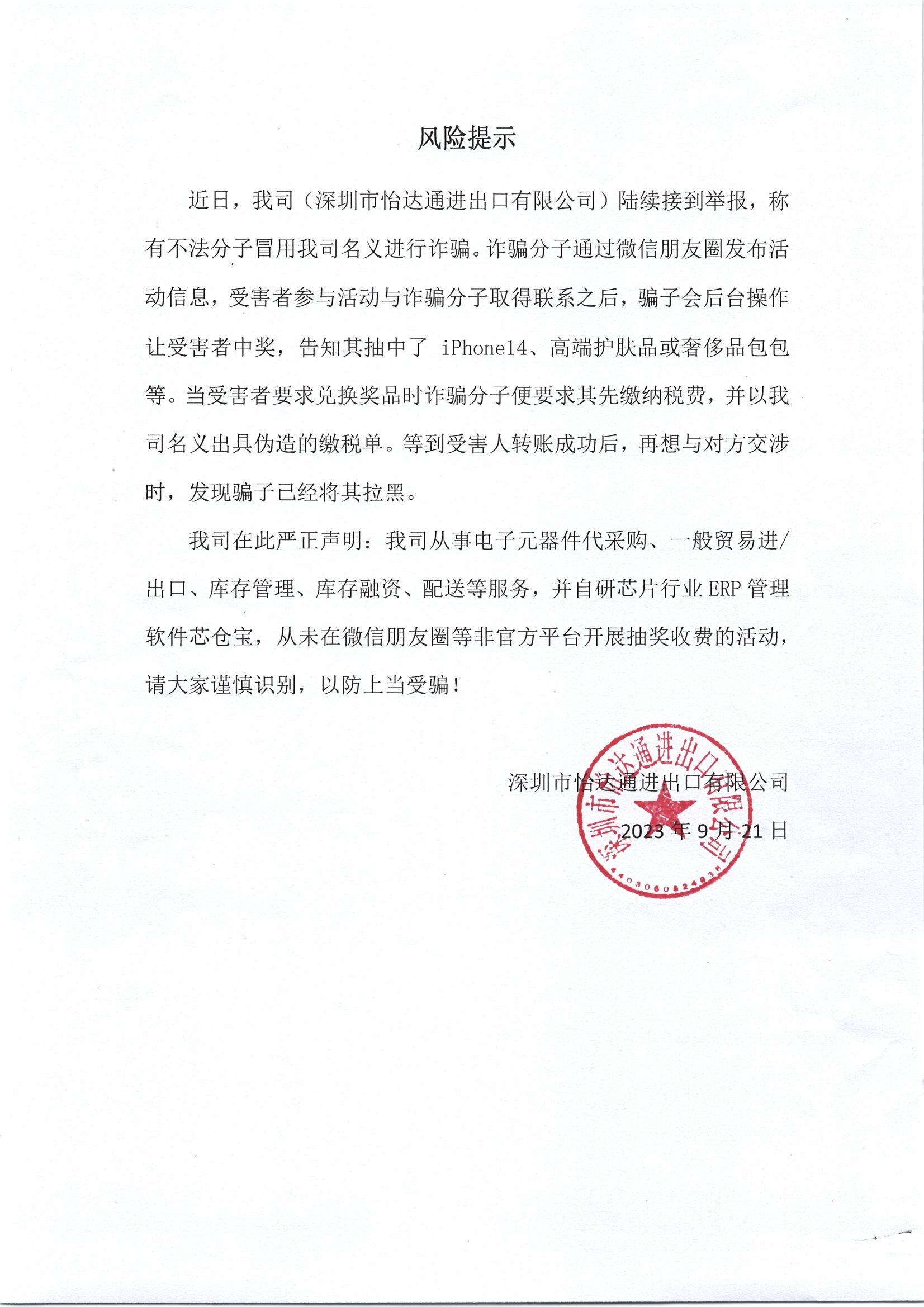 近日,我司(深圳市怡達(dá)通進(jìn)出口有限公司)陸續(xù)接到舉報(bào),稱(chēng)有不法分子冒用我司名義進(jìn)行詐騙。詐騙分子通過(guò)微信朋友圈發(fā)布活動(dòng)信息,受害者參與活動(dòng)與詐騙分子取得聯(lián)系之后,騙子會(huì)后臺(tái)操作讓受害者中獎(jiǎng),告知其抽中了iPhone14、高端護(hù)膚品或奢侈品包包等。當(dāng)受害者要求兌換獎(jiǎng)品時(shí)詐騙分子便要求其先繳納稅費(fèi),并以我司名義出具偽造的繳稅單。等到受害人轉(zhuǎn)賬成功后,再想與對(duì)方交涉時(shí),發(fā)現(xiàn)騙子已經(jīng)將其拉黑。